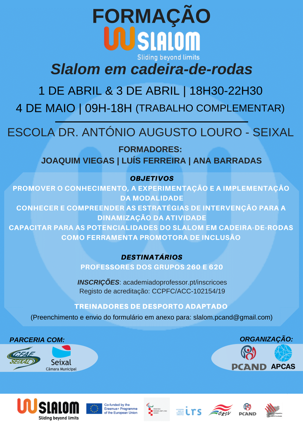 A PCAND, em colaboração com a APCAS, orgulha-se de anunciar que irá dinamizar nos próximos dias 1 e 3 de abril e 4 de Maio de 2019 a 2 e 3ª Edições da Formação para Treinadores de Slalom em cadeira-de-rodas (Módulos I e II), que terá lugar na Escoila Dr. António Augusto Louro, no Seixal.